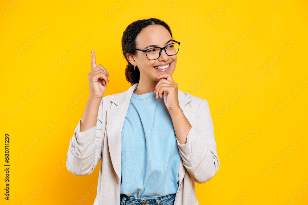 Joyful excited mixed race business woman, with glasses, holds her hand near chin, thoughtful looking aside, dreaming, planning, thinking, showing finger up, smiles, stand on isolated yellow background