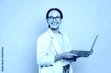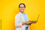 Happy successful stylish brazilian or hispanic business woman, company employee, consultant, with glasses, hold in hands open laptop, stand on isolated yellow background, looks aside, smiling