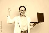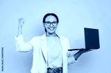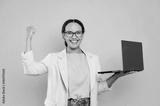 Joyful successful lovely mixed race business woman, consultant, with glasses, hold in hands open laptop, stand on isolated yellow background, looks at camera, smile, make YES gesture. Victory, success