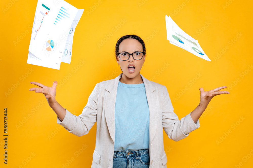 Annoyed angry mixed race business woman with glasses, in elegant wear, scatters financial documents in anger, looks at camera, stands on isolated yellow background, displeased facial expression