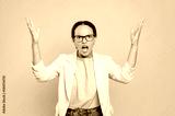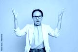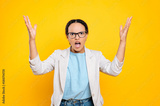 Confused puzzled worried displeased latino or brazilian woman, business lady, boss, screaming keeping mouth open, looking at camera irritated, gesturing hands, stands on isolated yellow background