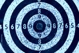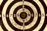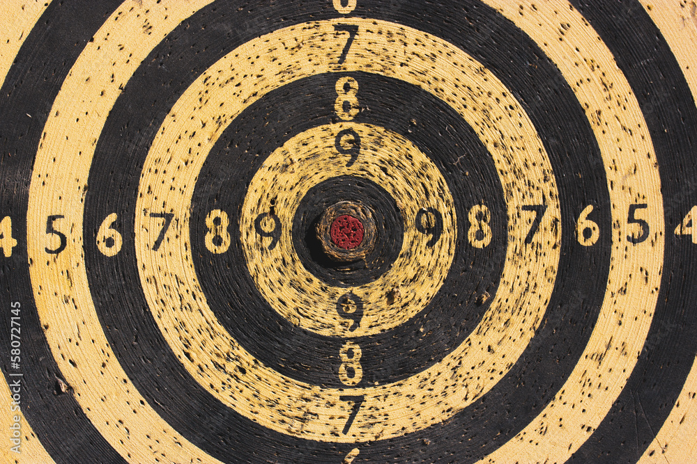 Yellow black dart wall. Round shape background. Dartboard center ring with the red eye. Target of business, opportunity concept. Abstract circle for concentration. Play a game. Spherical grunge form.