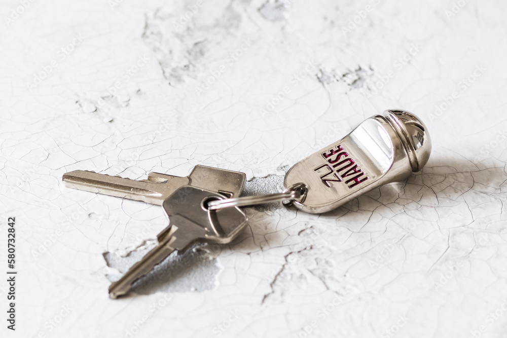 Key ring with two keys and tag with German text Zu Hause (translation: at home) on a white background, copy space