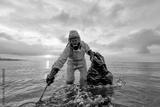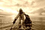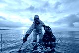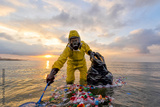 Slow violence. Volunteer biologist cleans up the ocean sea from plastic and corks wearing a suit and gas mask due to polluted waters. People protect the environment