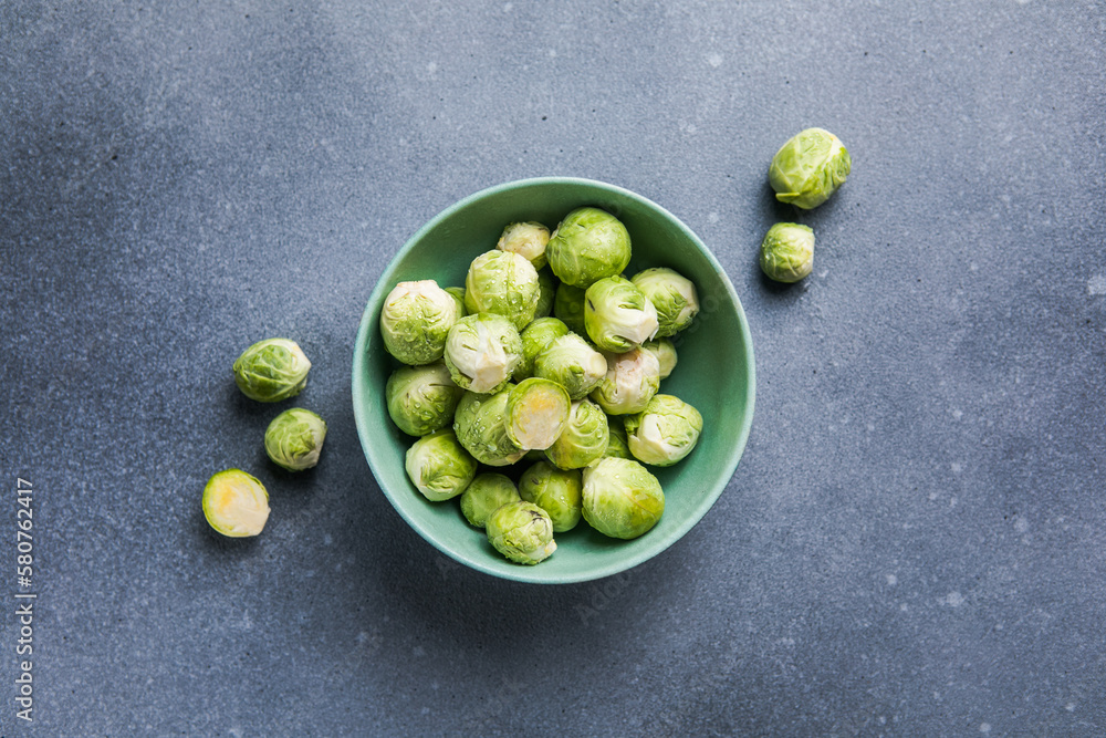 Raw Organic Brussel Sprouts in a Bowl, top view. Flat lay, overhead, from above. Copy space.