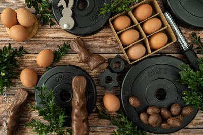 Gym dumbbells barbell weight plates, chocolate Easter bunnies, eggs and boxwood branches. Healthy diet choice concept. Fitness workout, sport training flat lay composition.