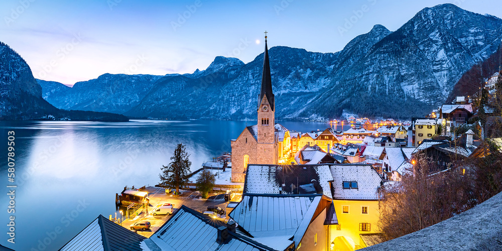 Famous Hallstatt mountain village in the Austrian Alps at sunrise, Austria