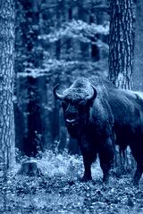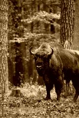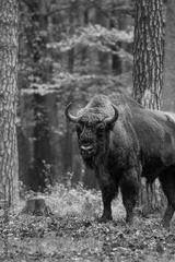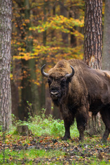 Stado żubrów w starym jesiennym lesie