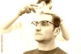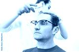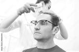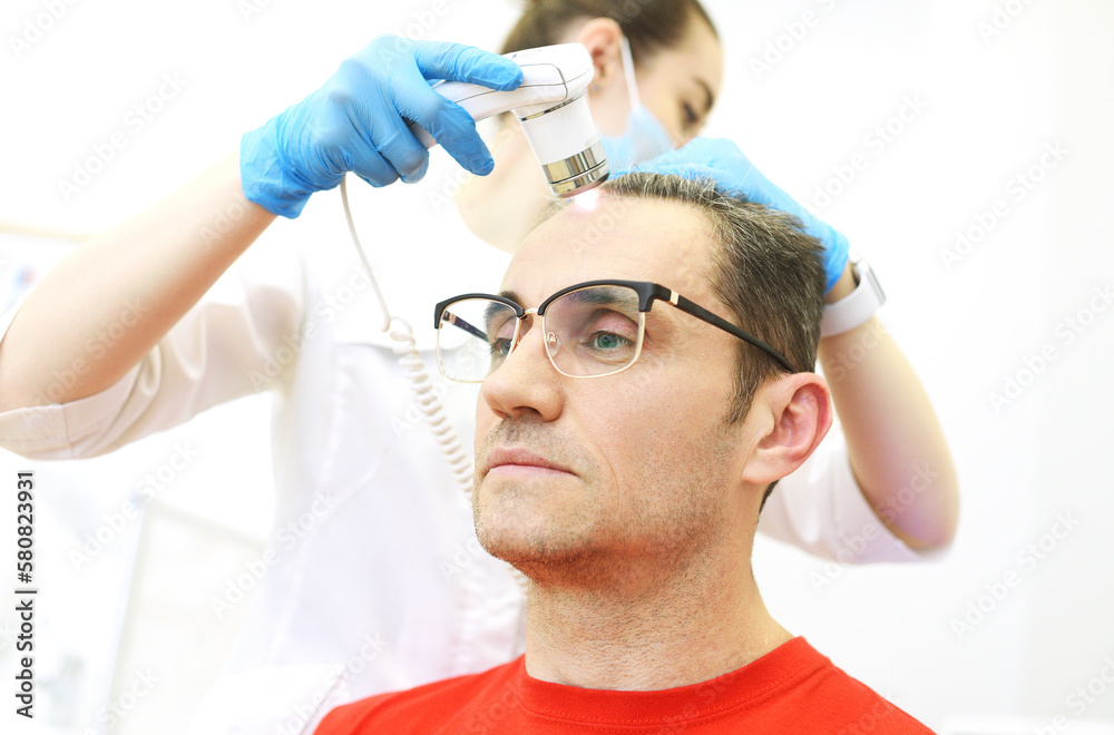 A cosmetologist-trichologist diagnoses the condition of a male patient's hair with gray hair using a trichoscope.