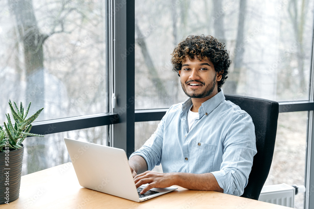 Positive satisfied Indian man, in stylish elegant clothes, company employee, executive, sits at a work desk, working in a laptop on a financial business plan, strategy, looks at camera, smile friendly