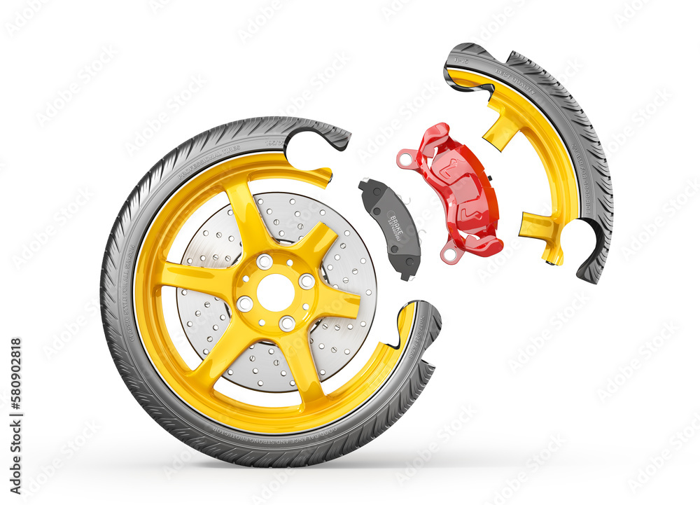 Wheel structure. Car wheel with brake isolated on a white background. 3d illustration