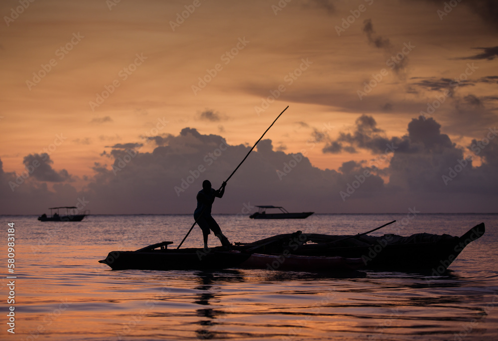 Zanzibar fisherman on the traditional boat in the sunrise light