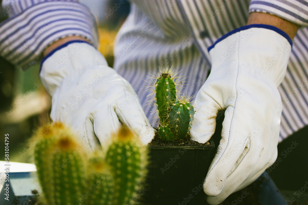 Gardener, farmer in white thorn proof gloves working in garden greenhouse replanting Pilosocereus pachycladus cacti. Small green cactuses cultivation, horticulture, floriculture. Small flower business