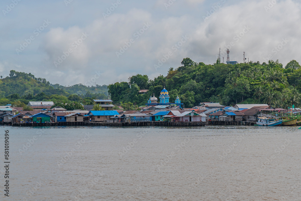 View from the ferry to Waisai at Sorong with boats and houses and a mosque