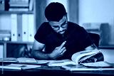 Student, black man and books to study on home desk thinking, reading and studying for college. Person learning and focused on information on page for education, knowledge and working on law research
