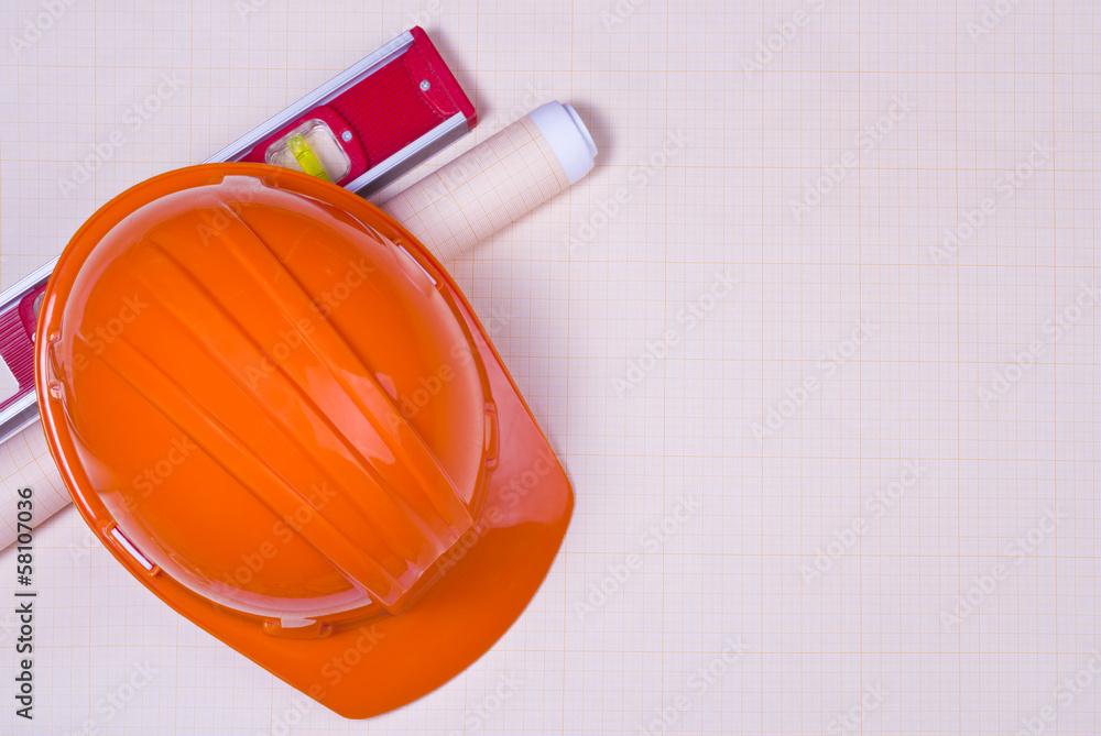 Construction background. Hard hat, level tool and graph paper