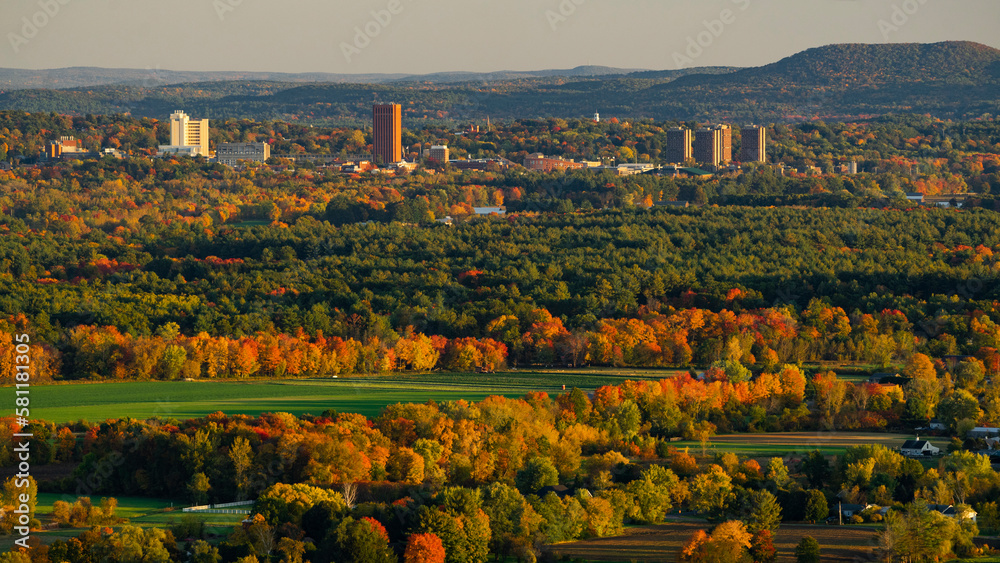 Fall foliage with the Greater Amherst, Massachusetts urban landscape in the distance
