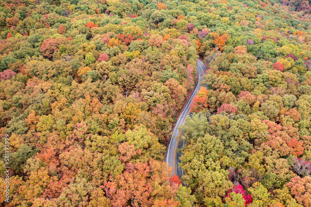 Aerial view of Fall Foliage colors with winding road in Northwest Arkansas landscape along state highway during Autumn season