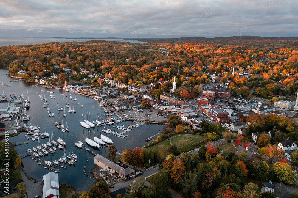 Panoramic view of sea harbor Camden, Maine town on east coast in New England, USA during sunrise in autumn season with fall foliage landscape