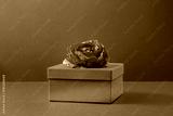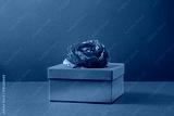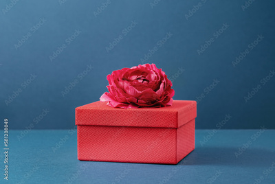 red gift box with matching flower bow on top on blue background. St Valentines birthday of Mothers Day. Holiday shopping and delivery or sale and discount concept wide banner