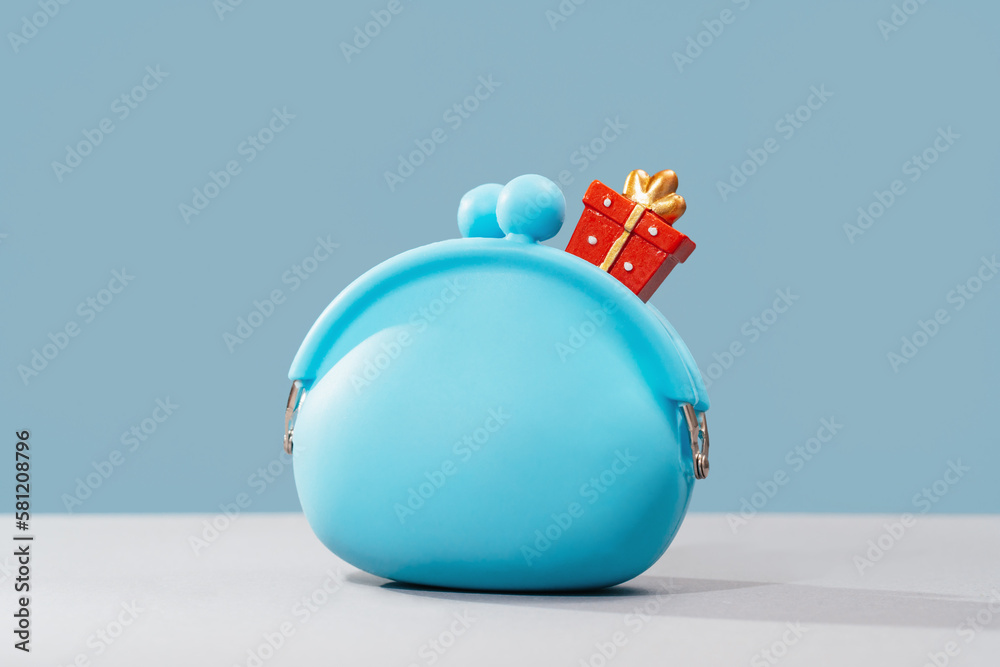 Red gift box in blue coin purse. Birthday or Mothers Fathers day gift card and voucher. Bank or store discount offer