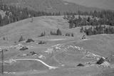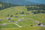 Authentic alpine shepherds' village and vivid green pastures on mountain plateau