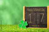 Happy St Patricks Day text calendar with shamrock charm. Four leaf clover. Party hat in vibrant green color. Save the date 17 March