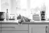 Cute red cat lying on counter in kitchen