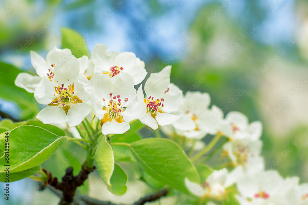 Spring apple tree branches with flowers. Natural floral seasonal easter background. Suitable for postcards. Selective focus. Copyspace.
