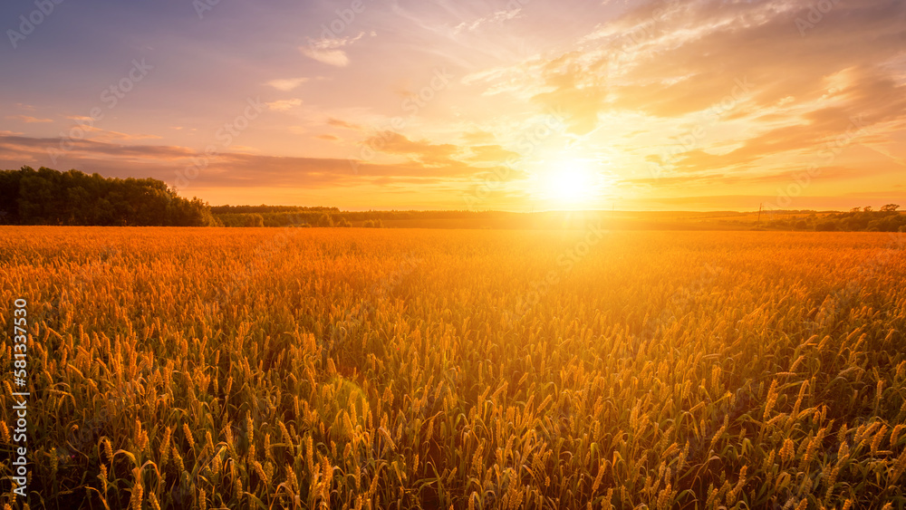 Scene of sunset on the field with young rye or wheat in the summer with a cloudy sky background.