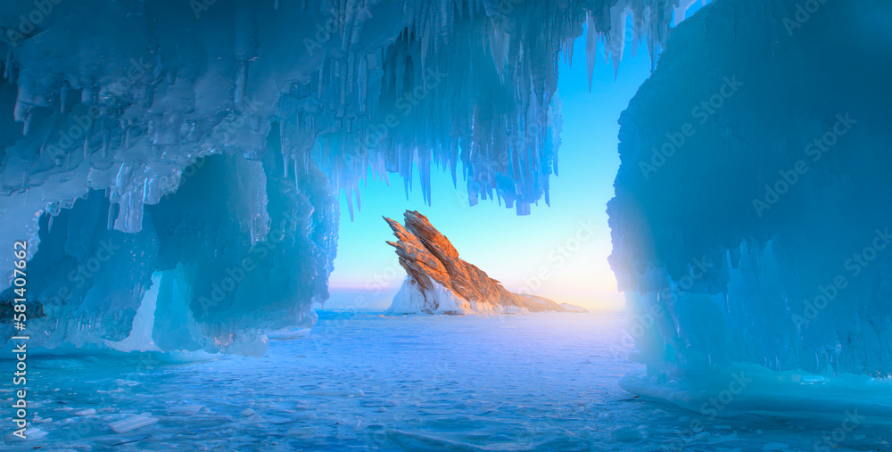 Ogoy island on winter Baikal lake with transparent cracked blue ice at sunrise Inside the turquoise ice cave - ice cave winter frozen nature background landscape - Lake Baikal, Siberia, Russia