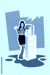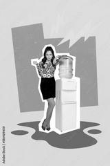 Vertical collage image of unsatisfied black white gamma girl put hand cooler bottle spit water floor isolated on drawing background