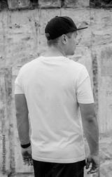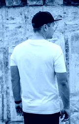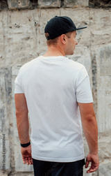 Young guy wearing white blank t-shirt and black cap. Mock-up for print. T-shirt template.