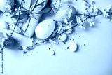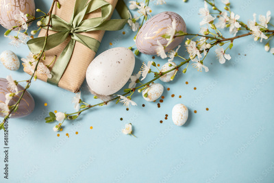 beautiful light easter layout with eco-wrapped gifts, golden and marble eggs, cherry blossoms and confetti on a pastel blue background. top view. copy space. flat lay. place for text