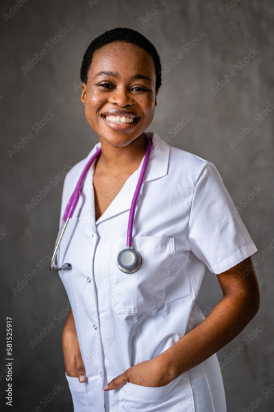 Portrait of a young smiling woman African-American ethnicity doctor standing with a stethoscope in a white uniform at a clinic