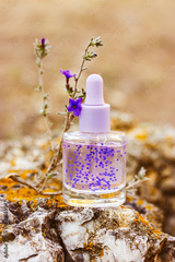 Cosmetic transparent glass dropper bottle with pipette and violet serum for moisturizing face body skin on a natural beige background on a platform of natural stone. Natural cosmetics beauty product.