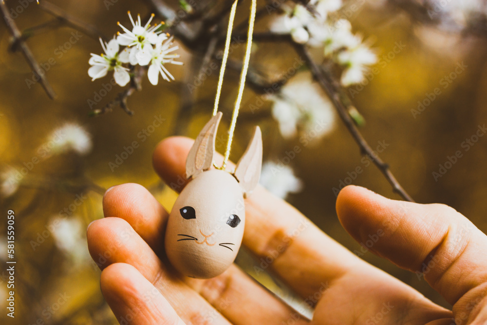 Brown cute funny wooden toy cat, kitten, kitty in a human's hand against blossoming spring tree. Decorative pendant, ornament decor for Easter holiday. Easter egg in spring garden. Cuteness animal.