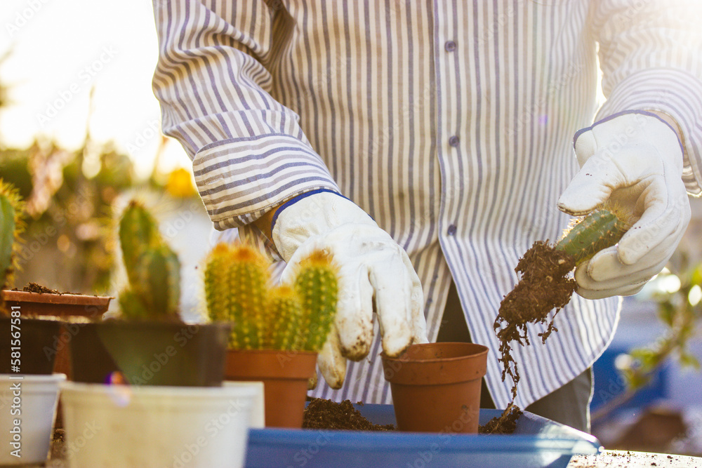 Male faceless gardener planting cacti, cactuses, succulents, planting plants in home garden, farm. Earth Day Concept. Growing and cultivation flowers, dessert plants. Hobby for pensioners, retirees.