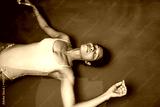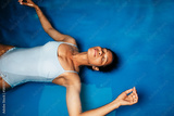 Middle-aged African American woman floating in tank filled with dense salt water used in meditation, therapy and alternative medicine.