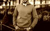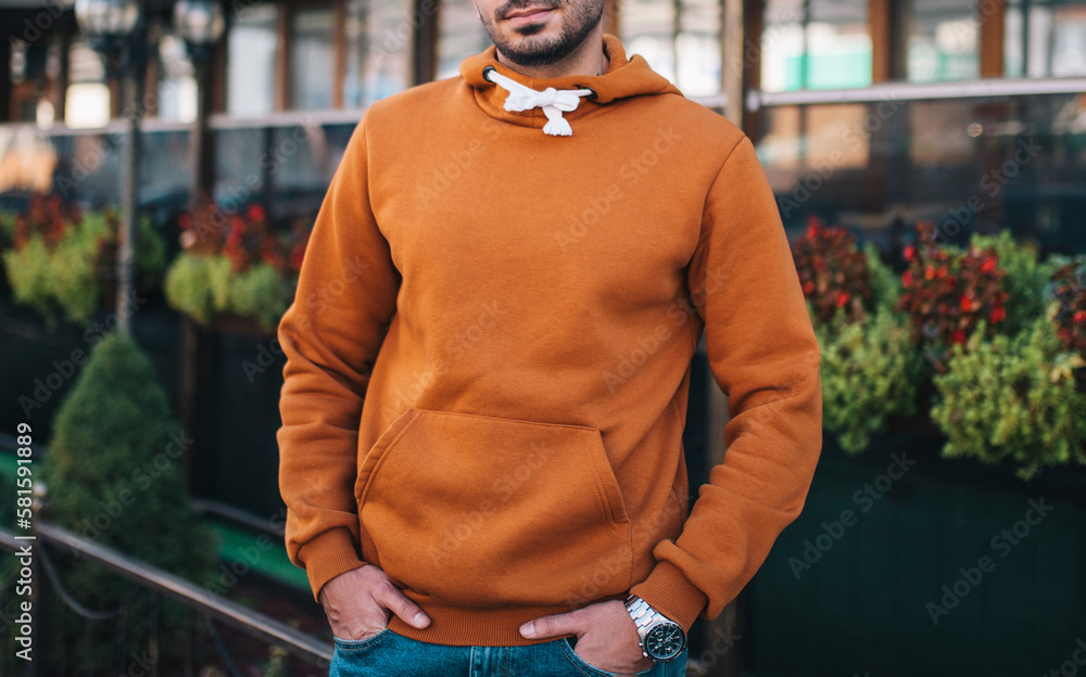 City portrait of handsome hipster guy with beard wearing brown blank hoodie or hoody with space for your logo or design. Mockup for print