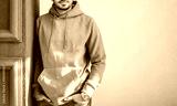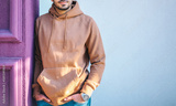 City portrait of handsome hipster guy with beard wearing brown blank hoodie or hoody with space for your logo or design. Mockup for print