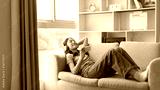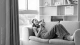 Woman happily listening to music on her favorite sofa in the living room, Relaxation time, Happy time, Feel good, Happy women resting at work after work is finished, Chill, Fatigue is eased.