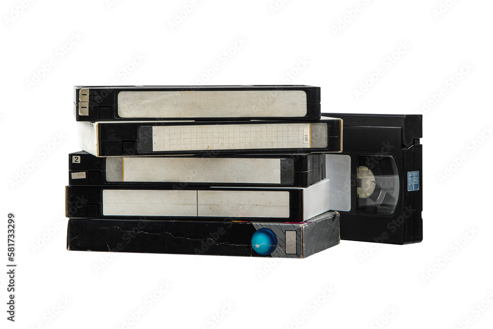 Pile of VHS video cassettes. Vintage media. Isolate on a white back.