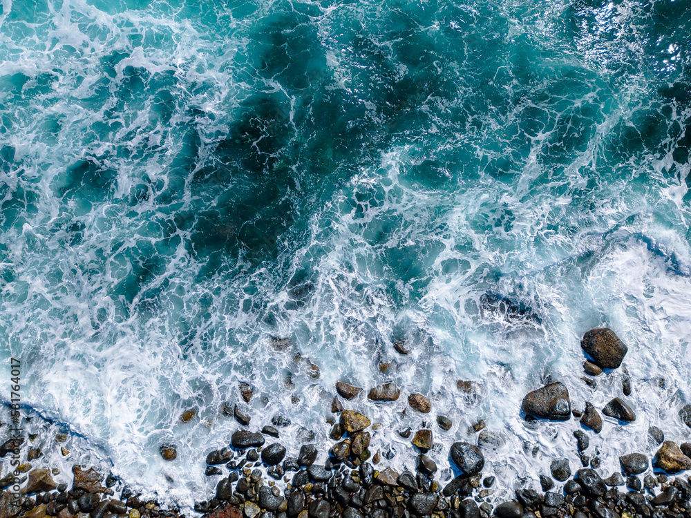 Aerial View to Ocean Waves. Blue Water Background. Top View of Foaming Blue Ocean Waters.