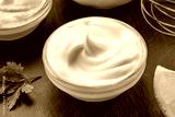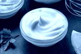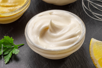 Glass bowl of homemade mayonnaise on black stone slate serving plate close-up.