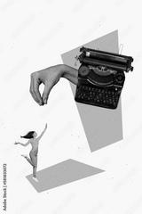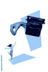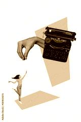 Creative retro 3d magazine collage image of lady arm typing vintage typewriter isolated painting background