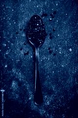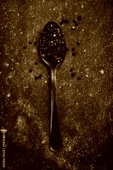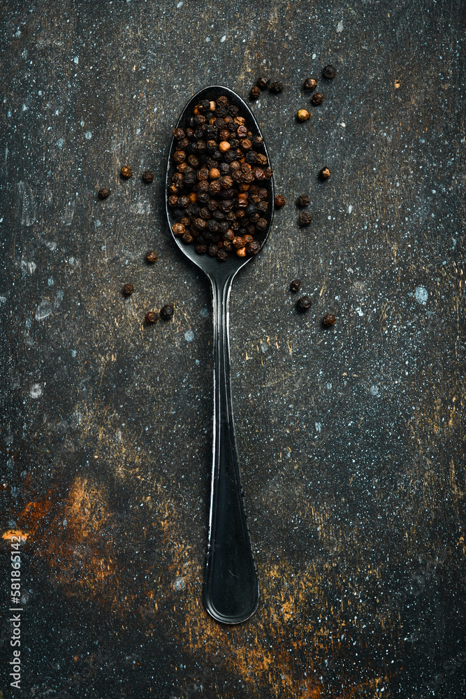 Fragrant black peppercorns in a metal spoon. Spices and condiments. Top view. On an old textured background.