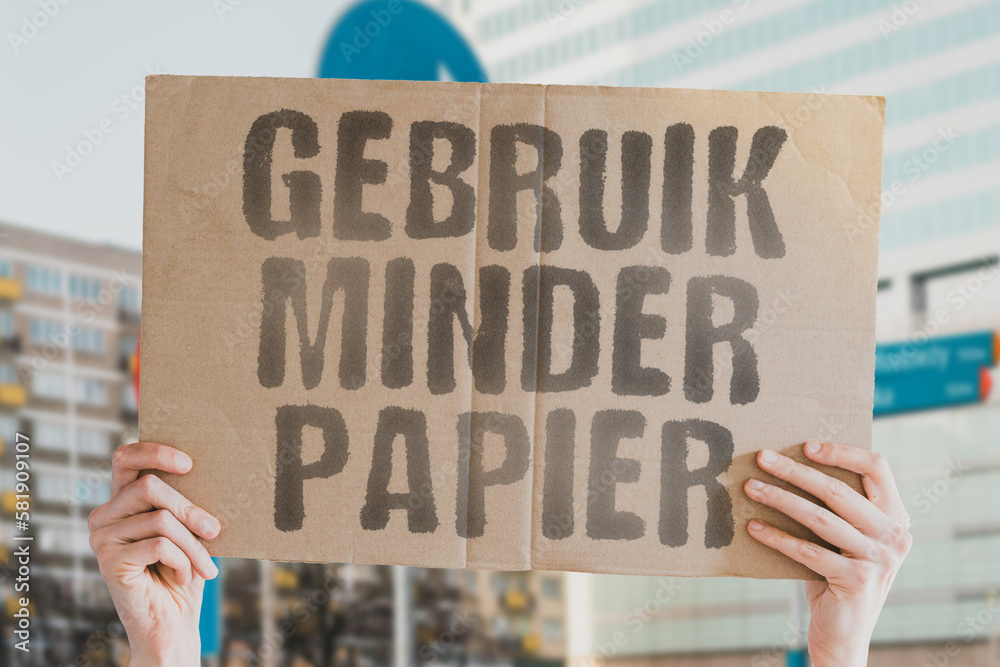 The phrase " Use less paper! " on a banner in men's hand with blurred background. Human impact on the environment. Environmental degradation. Nature. Forest. Trees. Modern technology