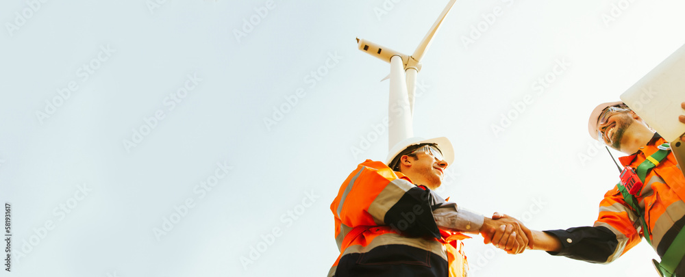 Two male engineer technicians brainstorming handshake while successful maintenance work on wind turbines, natural resources, renewable energy in wind farm : Panoramic banner.