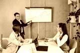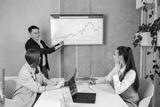 Asian businessman leads presentation with colleagues uses presentation TV with charts.